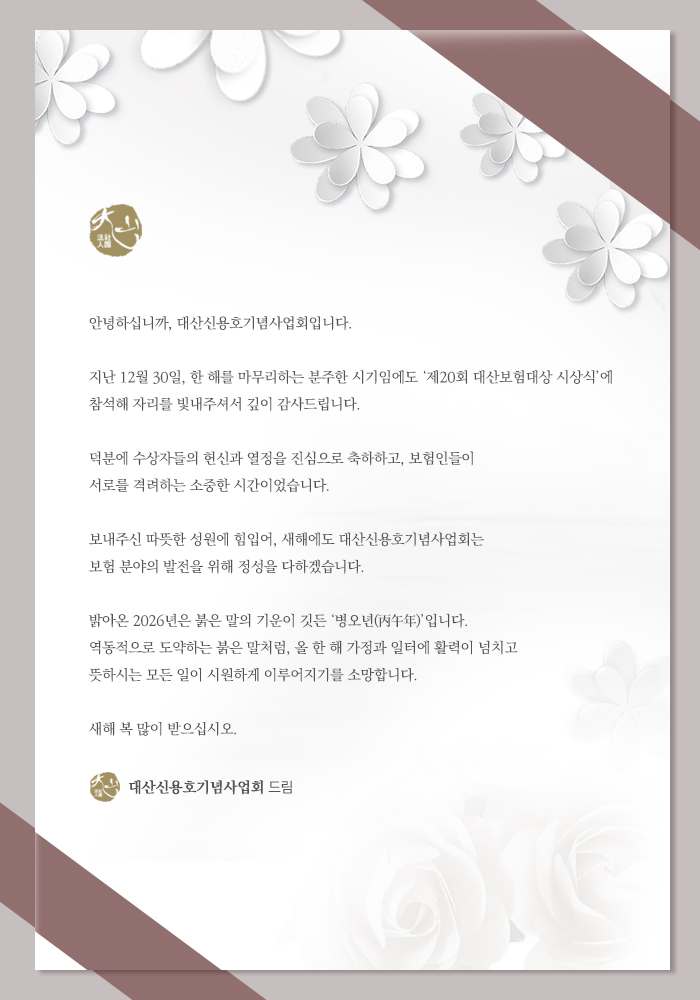 Áö³ 12¿ù 30ÀÏ, ÇÑ ÇØ¸¦ ¸¶¹«¸®ÇÏ´Â ºÐÁÖÇÑ ½Ã±âÀÓ¿¡µµ ¡®Á¦20ȸ ´ë»êº¸Çè´ë»ó ½Ã»ó½Ä¡¯¿¡ Âü¼®ÇØ ÀÚ¸®¸¦ ºû³»Áּż ±íÀÌ °¨»çµå¸³´Ï´Ù.